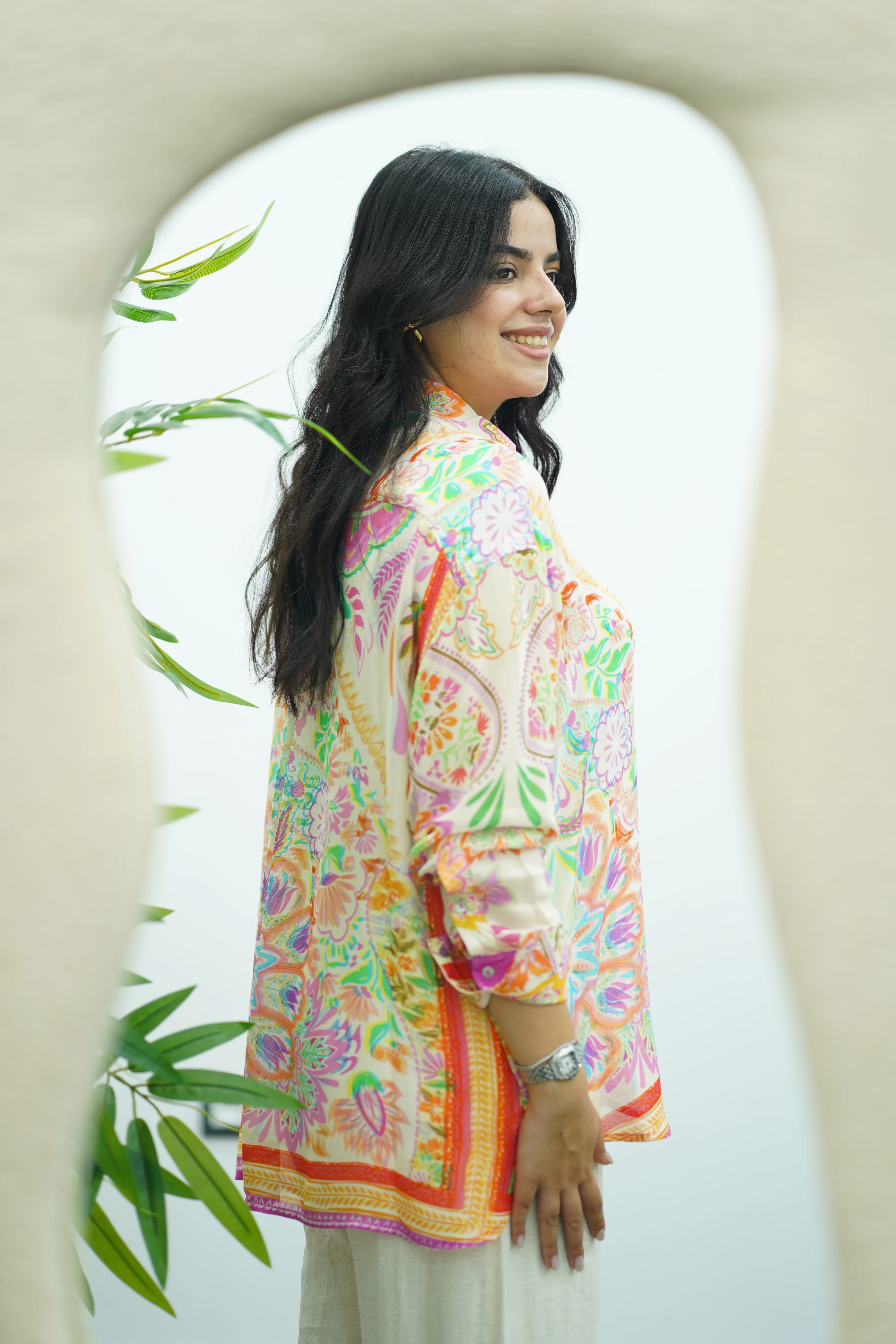 Apportez une touche de fraßcheur et de féminité à votre garde-robe avec cette magnifique chemise oversize au motif floral coloré. Confectionnée dans un tissu fluide et léger, elle vous offre un confort optimal tout en mettant en valeur votre style.