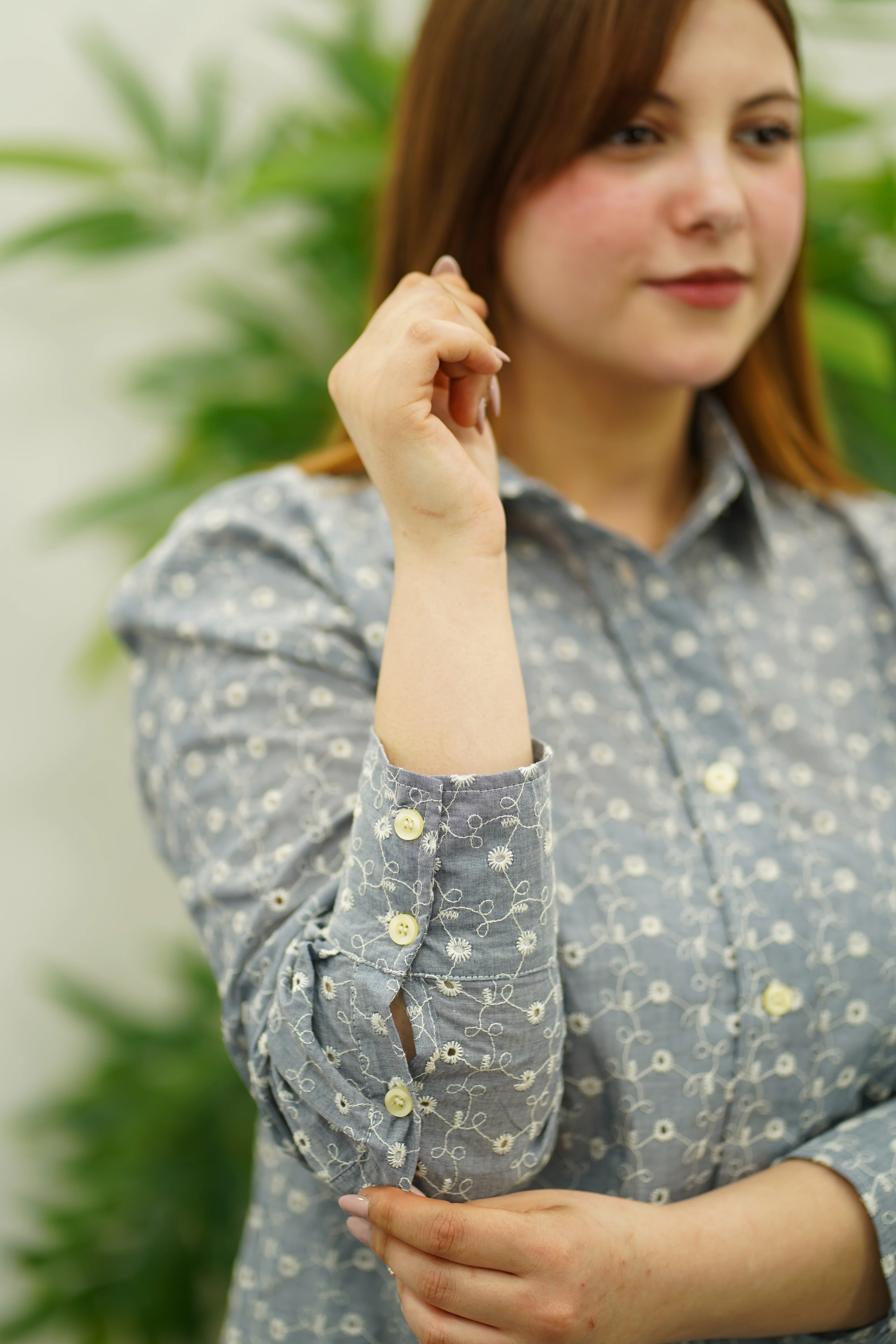 Craquez pour cette chemise en broderie anglaise gris clair, parfaite pour un look raffiné et romantique. Sa coupe fluide cache joliment le bassin tout en mettant en valeur la silhouette. Le col classique apporte une touche de structure, tandis que les boutons décoratifs dans le dos ajoutent une note originale et délicate.