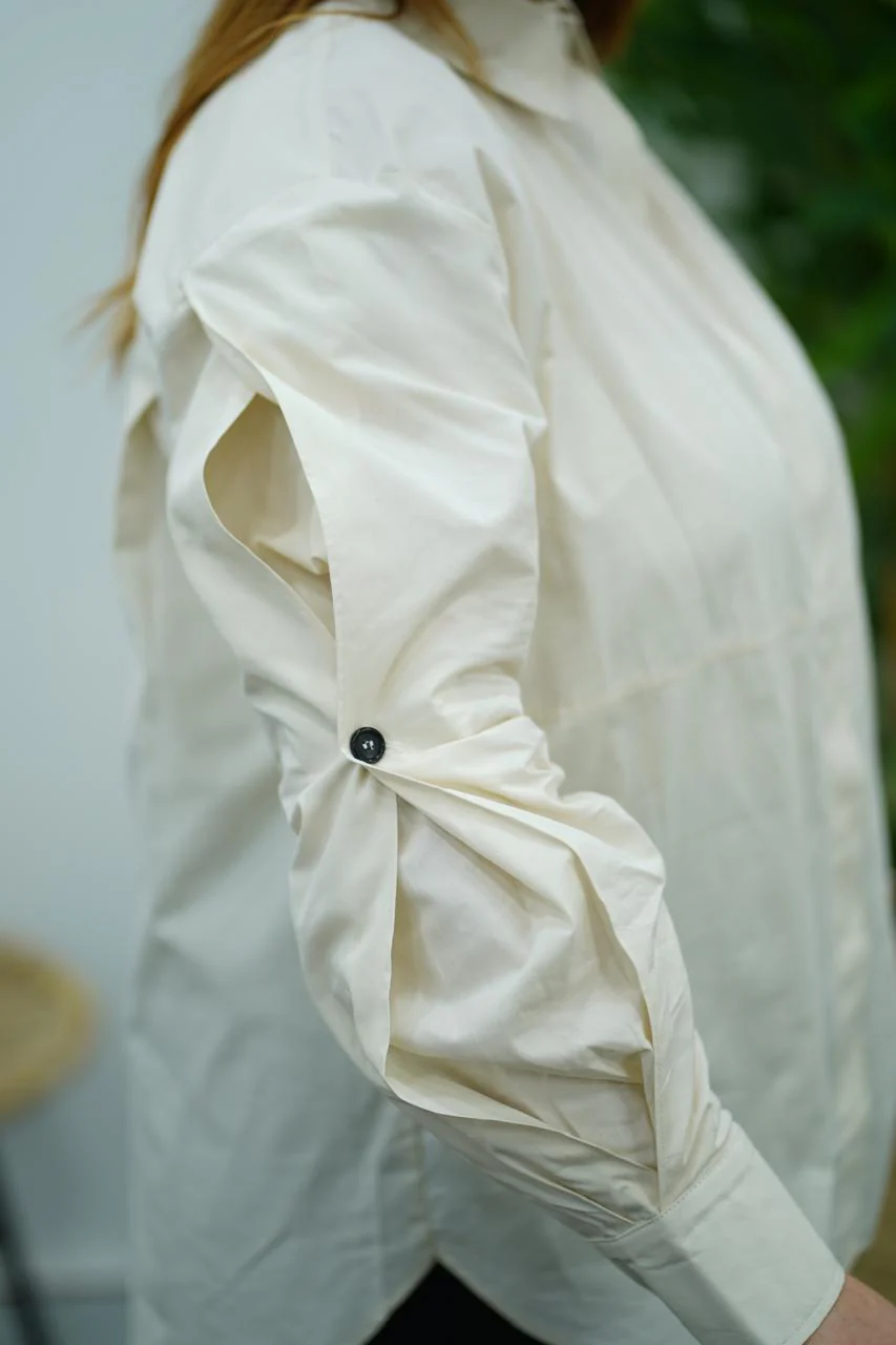 Adoptez un look chic et décontracté avec cette chemise en popeline au blanc cassé. Sa coupe droite et fluide, accompagnée de manches longues légèrement froncées, apporte une touche d’originalité tout en gardant une allure sobre et élégante. Fermeture boutonnée dissimulée pour une finition épurée, et col classique structuré.