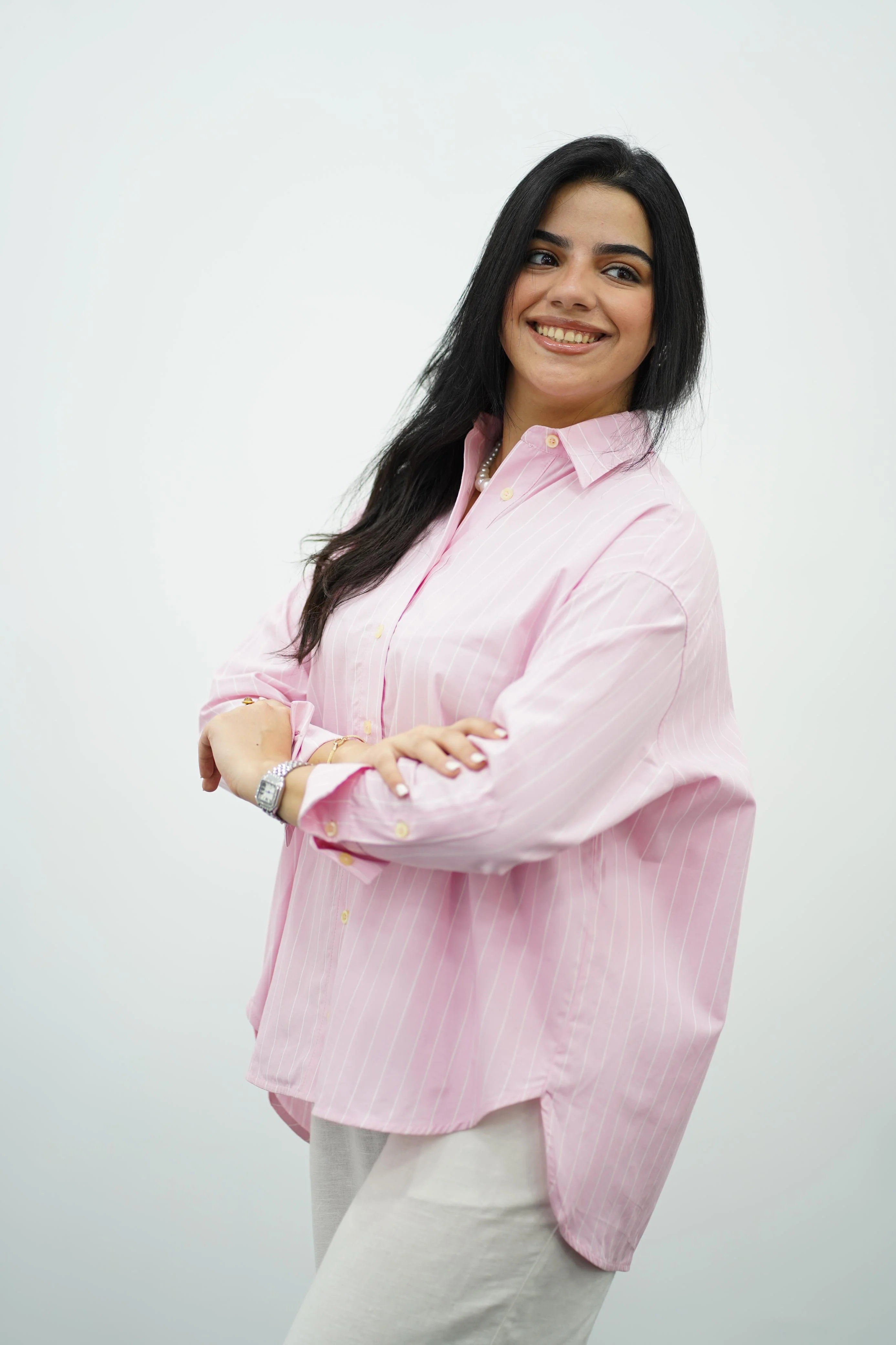 - Chemise ample à rayures fines, couleur rose pâle, avec une allure douce et féminine.