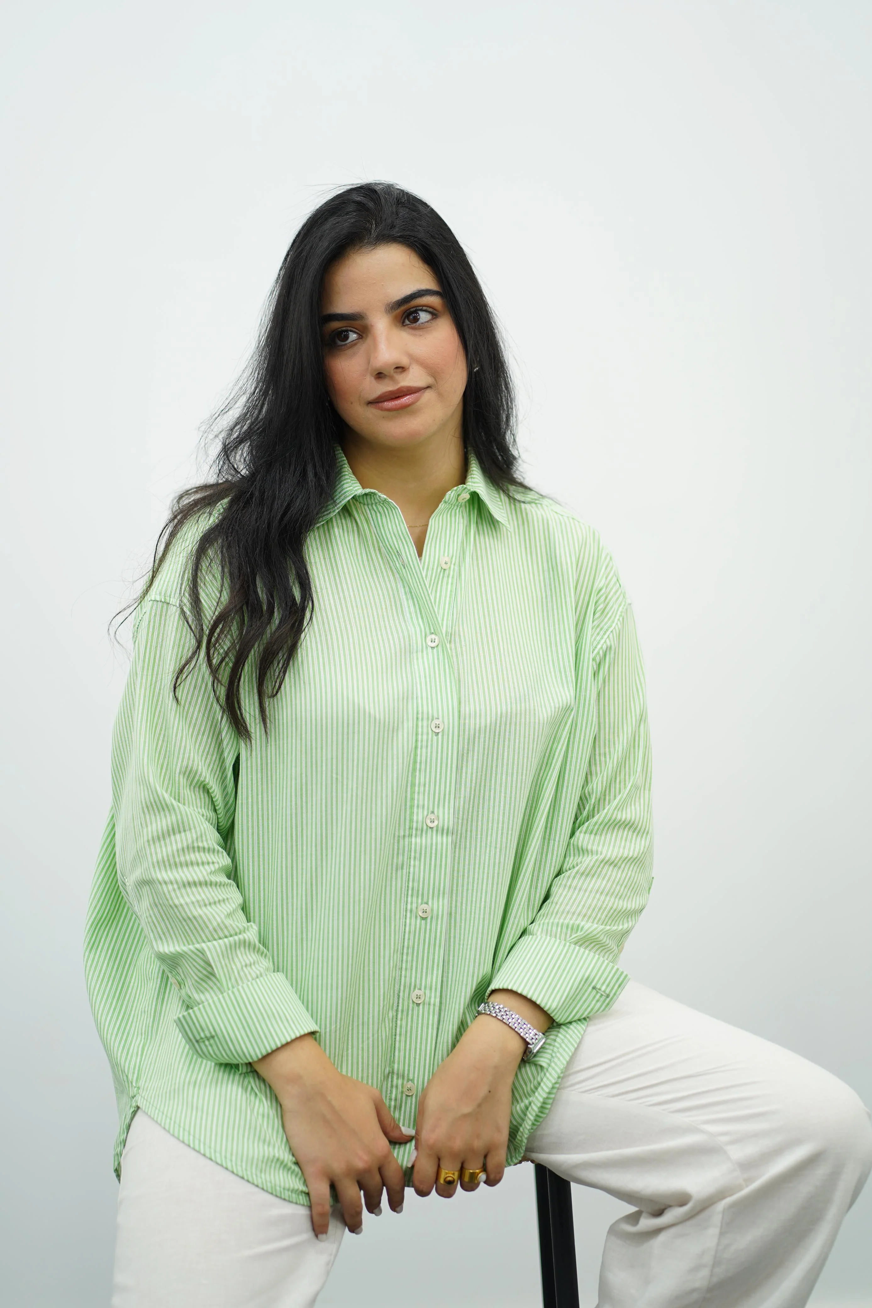 Chemise oversize en coton léger, ornée de fines rayures verticales vert menthe et blanches. Sa coupe ample et décontractée est idéale pour un look frais et moderne. Elle se distingue par son col classique et son ourlet fendu qui assure fluidité et confort.