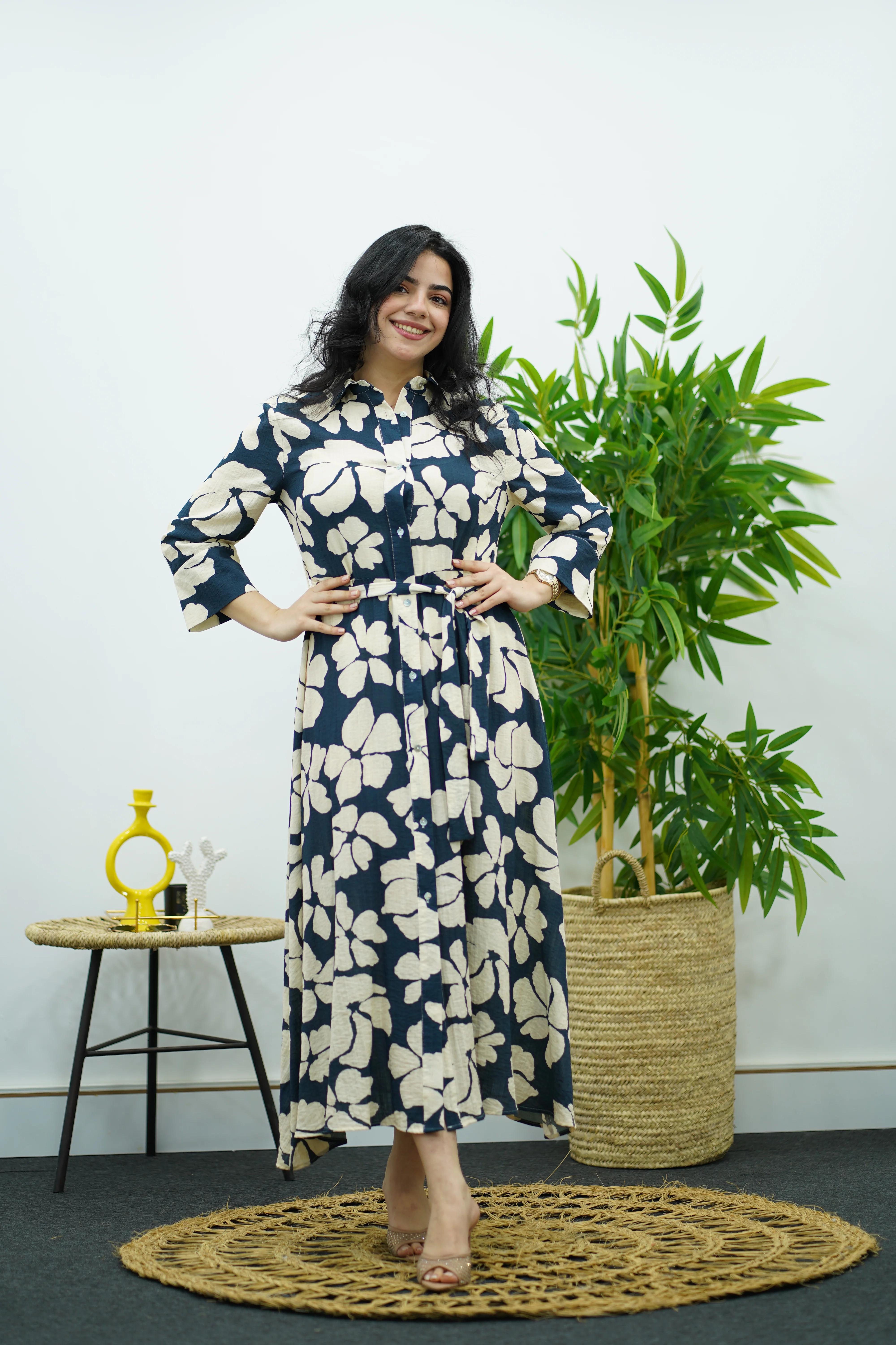 Robe à Fleurs Bleu Nuit et Beige En Lin avec Ceinture – Chic Intemporel